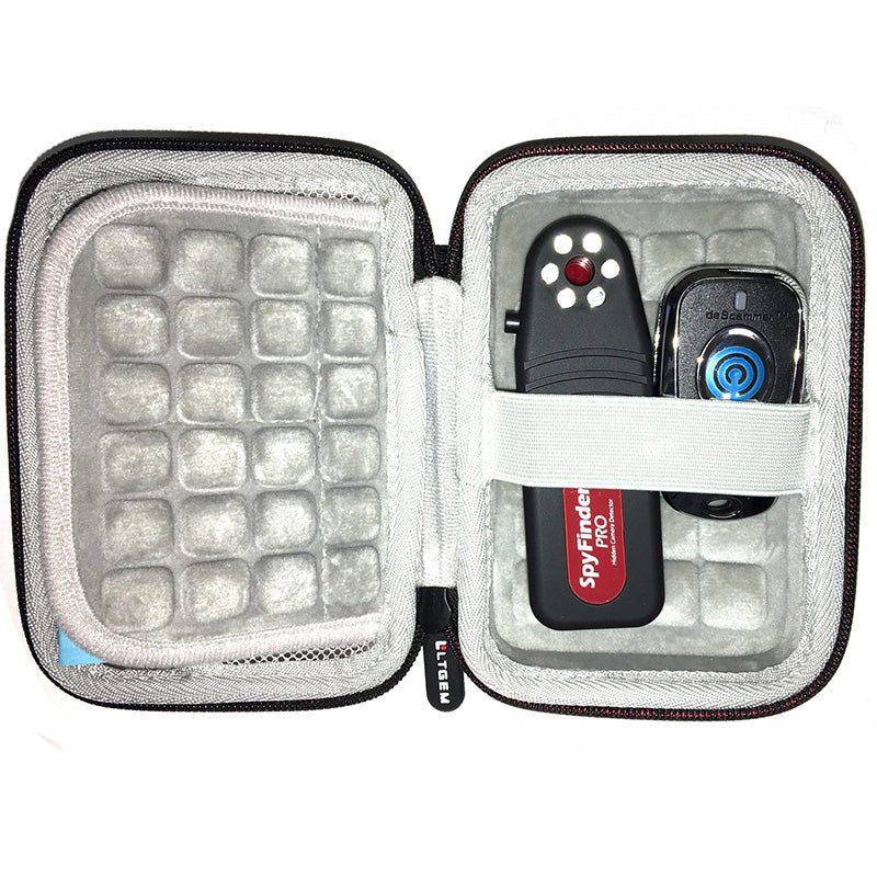 The first item in this handy travel case is the easy-to-use hidden camera lens finder SpyFinder Pro! Whenever the traveler checks into a hotel, AirbnB, or any overnight accommodation that's not in your own home, use the SpyFinder Pro to sweep the room for any camera. Spy Finder Pro will find hidden cameras regardless of whether they are powered on or off. Protect your privacy in one quick sweep.
